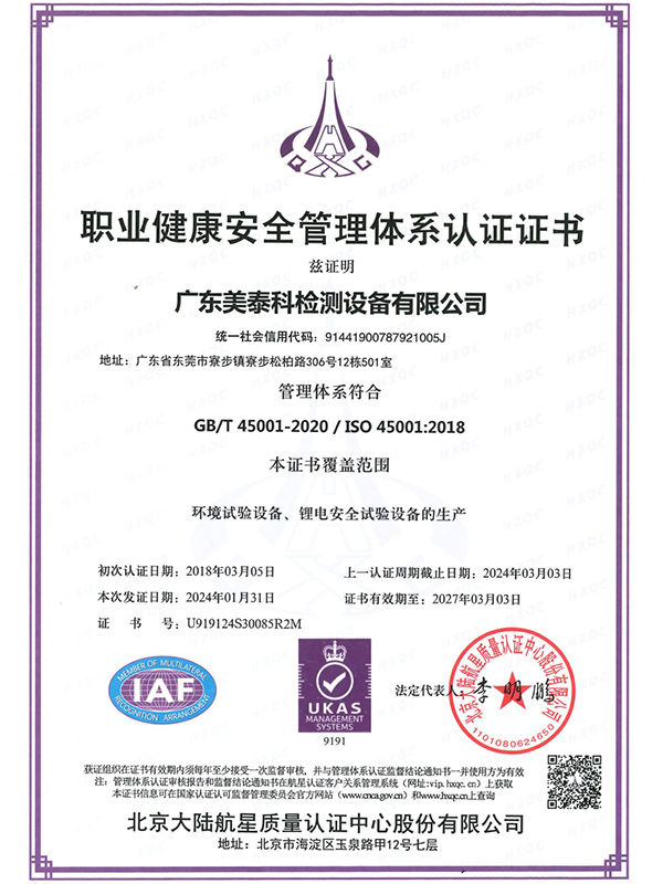 职业健康安全管理体系认证证书